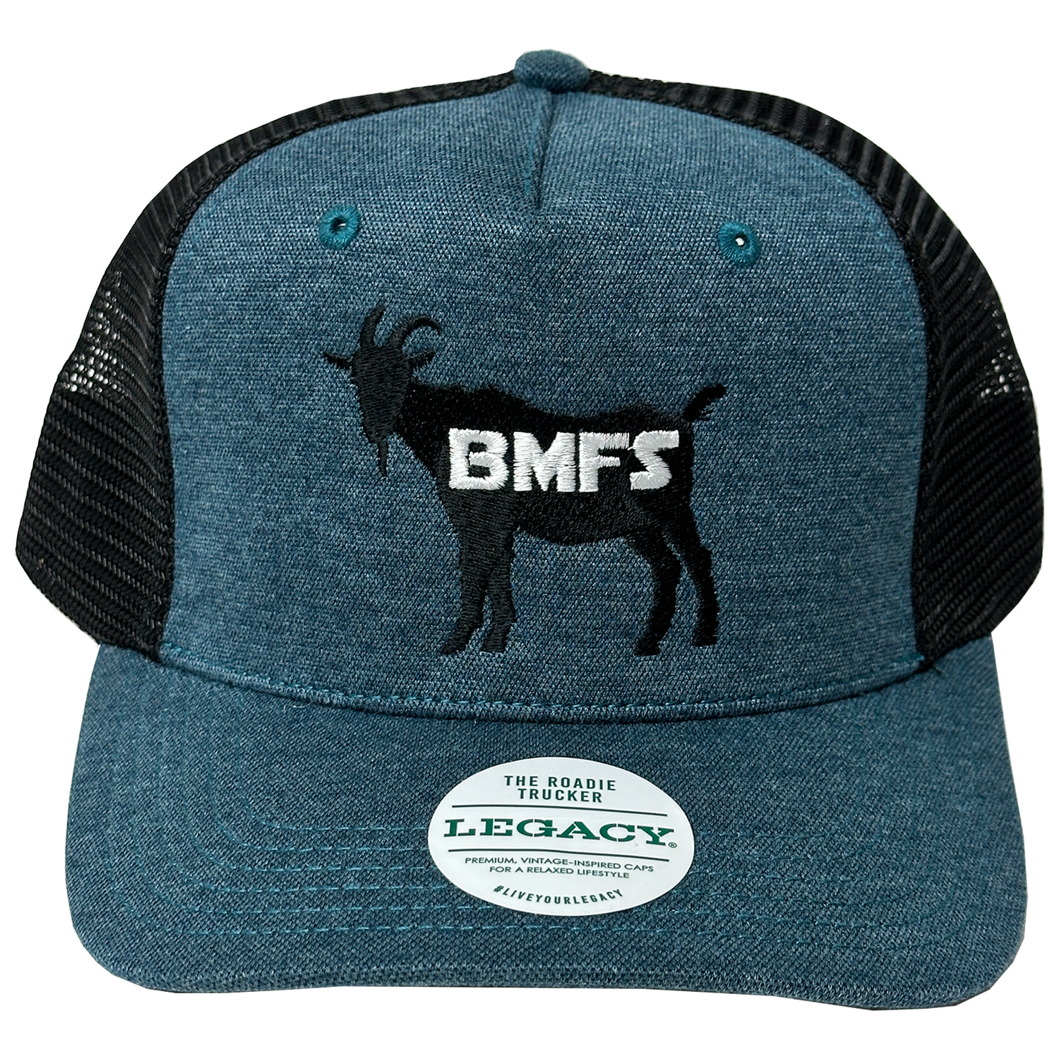 This structured trucker hat features embroidered BMFS goat silhouette design.